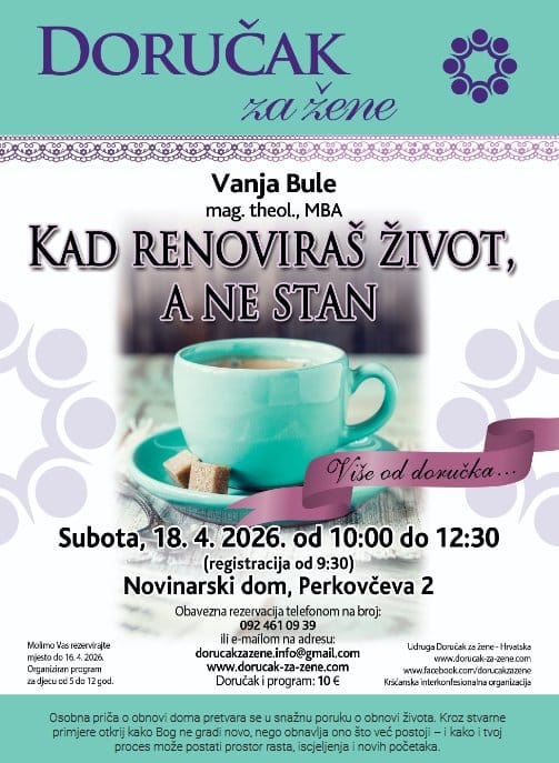 Doručak za žene „Kad renoviraš život, a ne stan“ održati će se 18. travnja 2026. godine u Novinarskom domu, Perkovčeva 2, Zagreb s početkom u 10:00 sati.